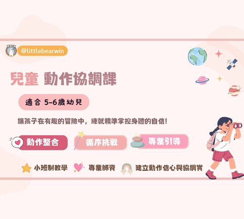 5-6 歲|身體掌控力:全方位動作整合班 在挑戰中建立自信,讓孩子的肢體動作成熟更有力! 5-6 歲是動作發展的關鍵期,我們透過循序漸進的挑戰,引導孩子在有趣的遊戲中練習身體運用。從動作整合到流暢度訓練,專業教練會觀察每位孩子的協調限制並精準引導,在適度挑戰中累積成功經驗。採 1:3-4 極小班制教學,給予孩子最高品質的指導,讓動作更穩健、自信更充足!?✨