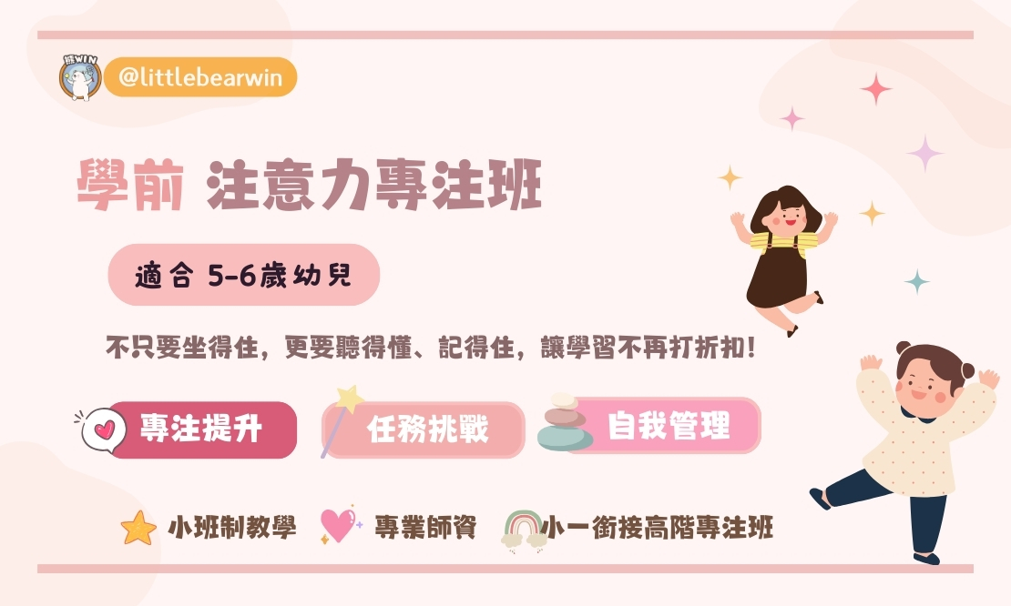 即將進入國小,孩子準備好坐滿 40 分鐘了嗎?5-6 歲的訓練重點在於「選擇性、交替性與同時性專注」。本課程針對團體任務中常見的分心場景,訓練孩子在雜訊中篩選重要資訊的能力。我們運用視覺搜尋、聽覺記憶與執行功能挑戰,強化處理複雜任務的穩定度,協助孩子從容應對小一課堂要求。