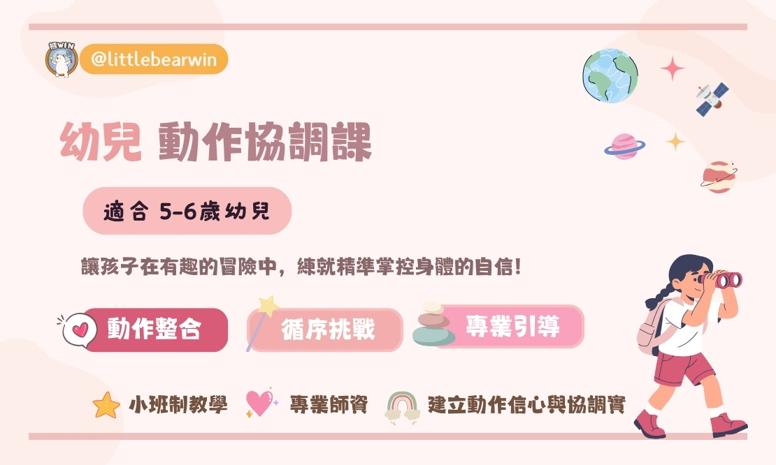 5-6 歲是動作能力成熟的重要階段。我們將專業的物理治療觀點融入有趣的冒險挑戰,帶領孩子從「精準控制」到提升「全身協調」。透過循序漸進的活動設計,引導孩子在適度挑戰中建立成功經驗,讓孩子告別動作笨拙感,找回對身體的掌控力與閃亮自信。